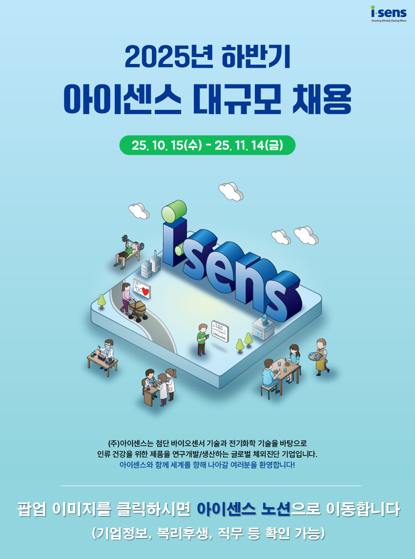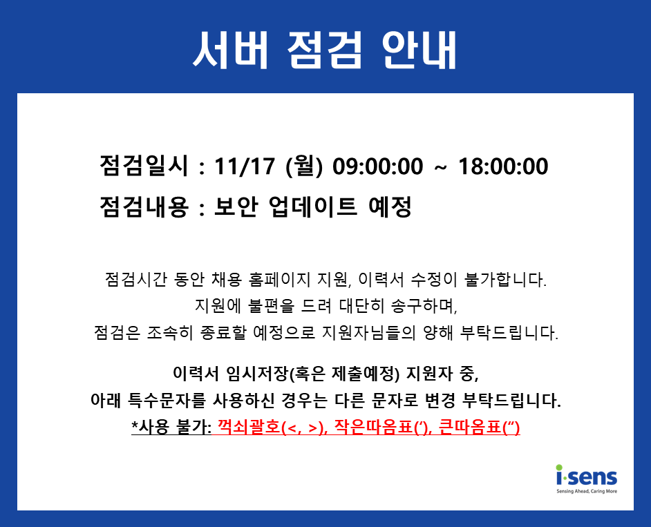 주식회사 아이센스(이하 '회사'라고 함)는 지원자의 개인정보보호를 매우 중요하게 여기고 있으며, "개인정보보호법" 및 "정보통신망 이용촉진 및 정보보호 등에 관한 법률" 등 개인정보보호에 관한 제반 법령을 준수하고 있습니다. 회사는 본 개인정보처리방침을 회사 채용 홈페이지 첫 화면 또는 입사지원 화면을 통하여 공개함으로써 지원자가 제공하는 개인정보가 어떠한 용도와 방식으로 이용되고 있으며 당사가 지원자의 개인정보를 안전하게 취급하기 위하여 어떠한 조치를 취하고 있는지를 지원자가 용이하게 확인할 수 있도록 조치하고 있습니다.