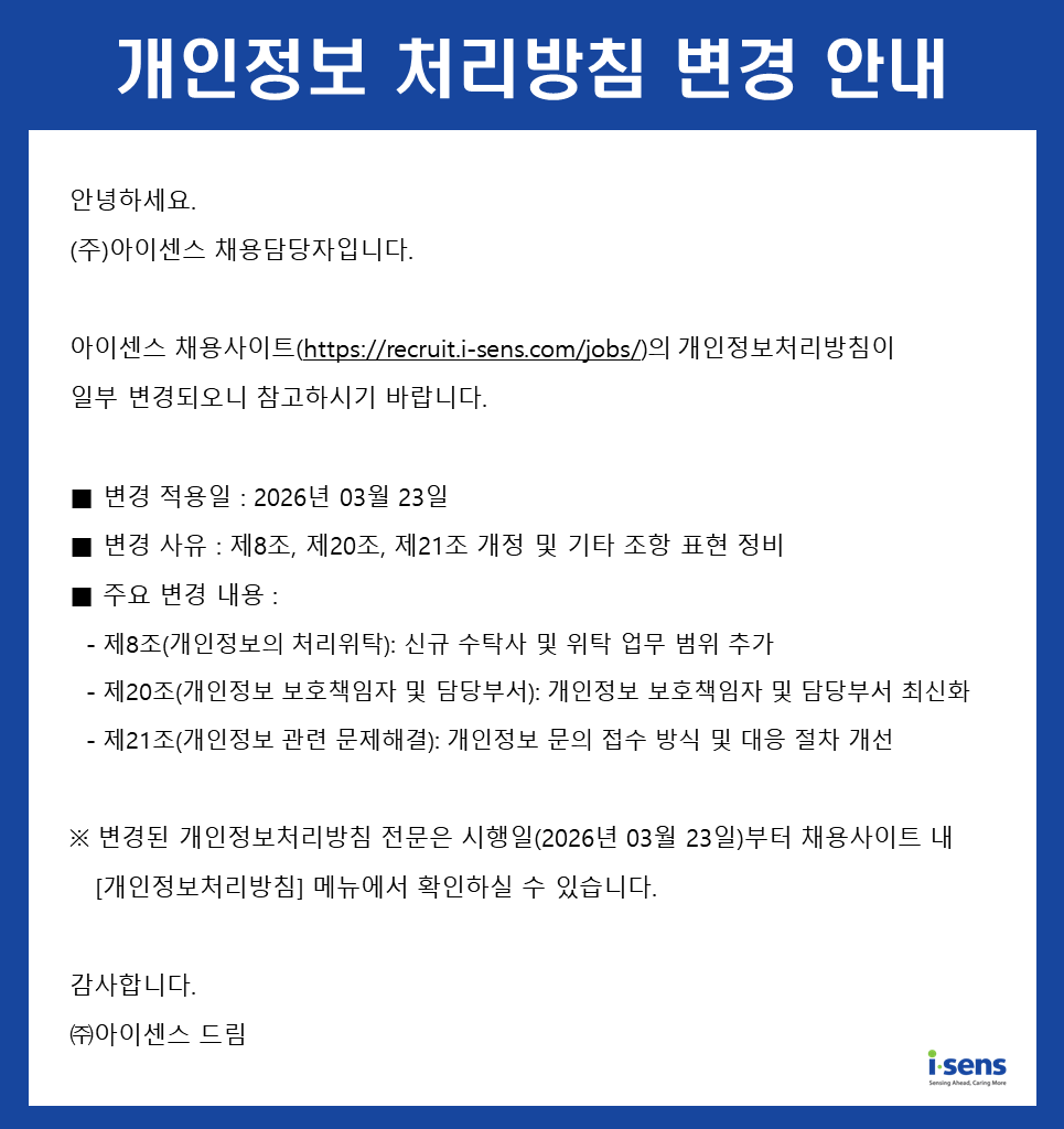 주식회사 아이센스(이하 '회사'라고 함)는 지원자의 개인정보보호를 매우 중요하게 여기고 있으며, "개인정보보호법" 및 "정보통신망 이용촉진 및 정보보호 등에 관한 법률" 등 개인정보보호에 관한 제반 법령을 준수하고 있습니다. 회사는 본 개인정보처리방침을 회사 채용 홈페이지 첫 화면 또는 입사지원 화면을 통하여 공개함으로써 지원자가 제공하는 개인정보가 어떠한 용도와 방식으로 이용되고 있으며 당사가 지원자의 개인정보를 안전하게 취급하기 위하여 어떠한 조치를 취하고 있는지를 지원자가 용이하게 확인할 수 있도록 조치하고 있습니다.